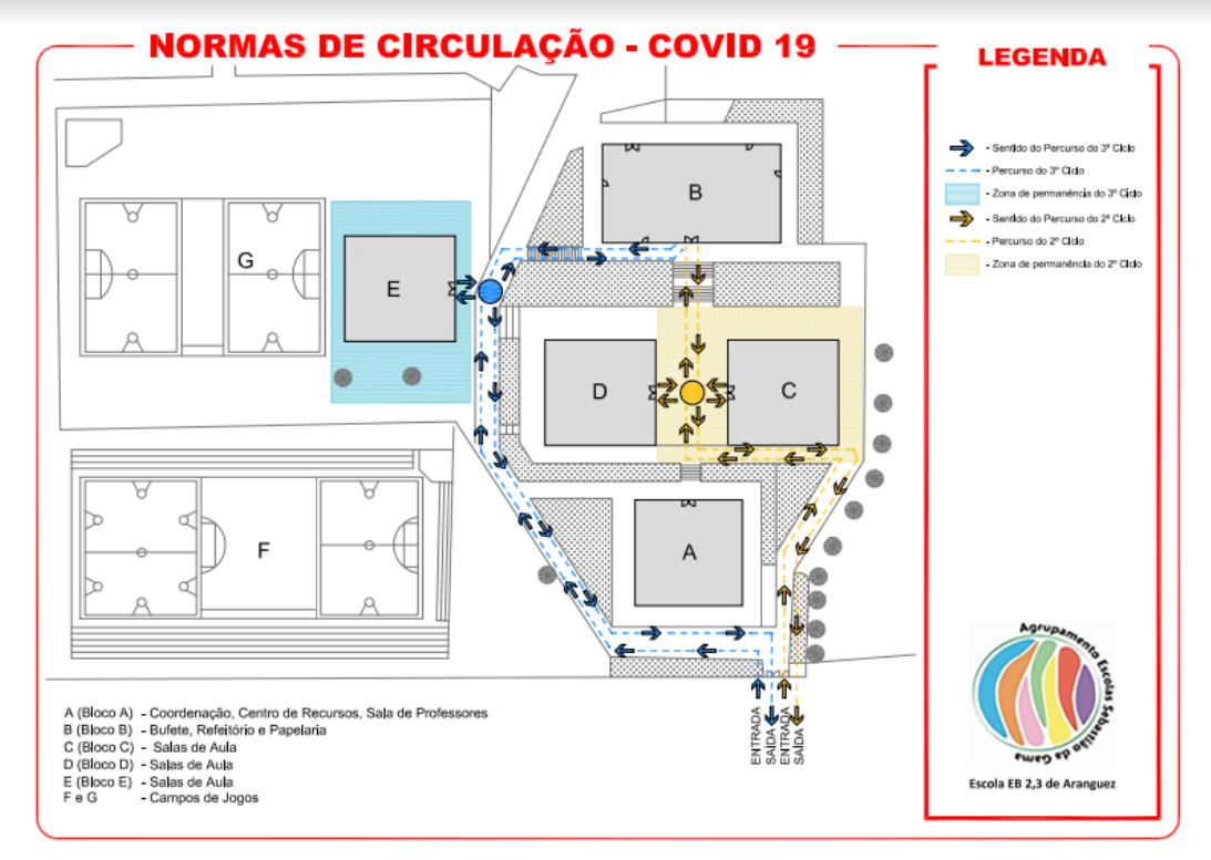 Foram definidos e identificados circuitos e procedimentos no interior da escola, que promovam o distanciamento físico, nomeadamente no percurso desde a entrada da escola até à sala de aula e nos acessos aos locais de atendimento e convívio como, por exemplo: refeitório, bufete/bar, papelaria, salas de apoio, polivalente, entradas de pavilhões, casas de banho e sala de isolamento.